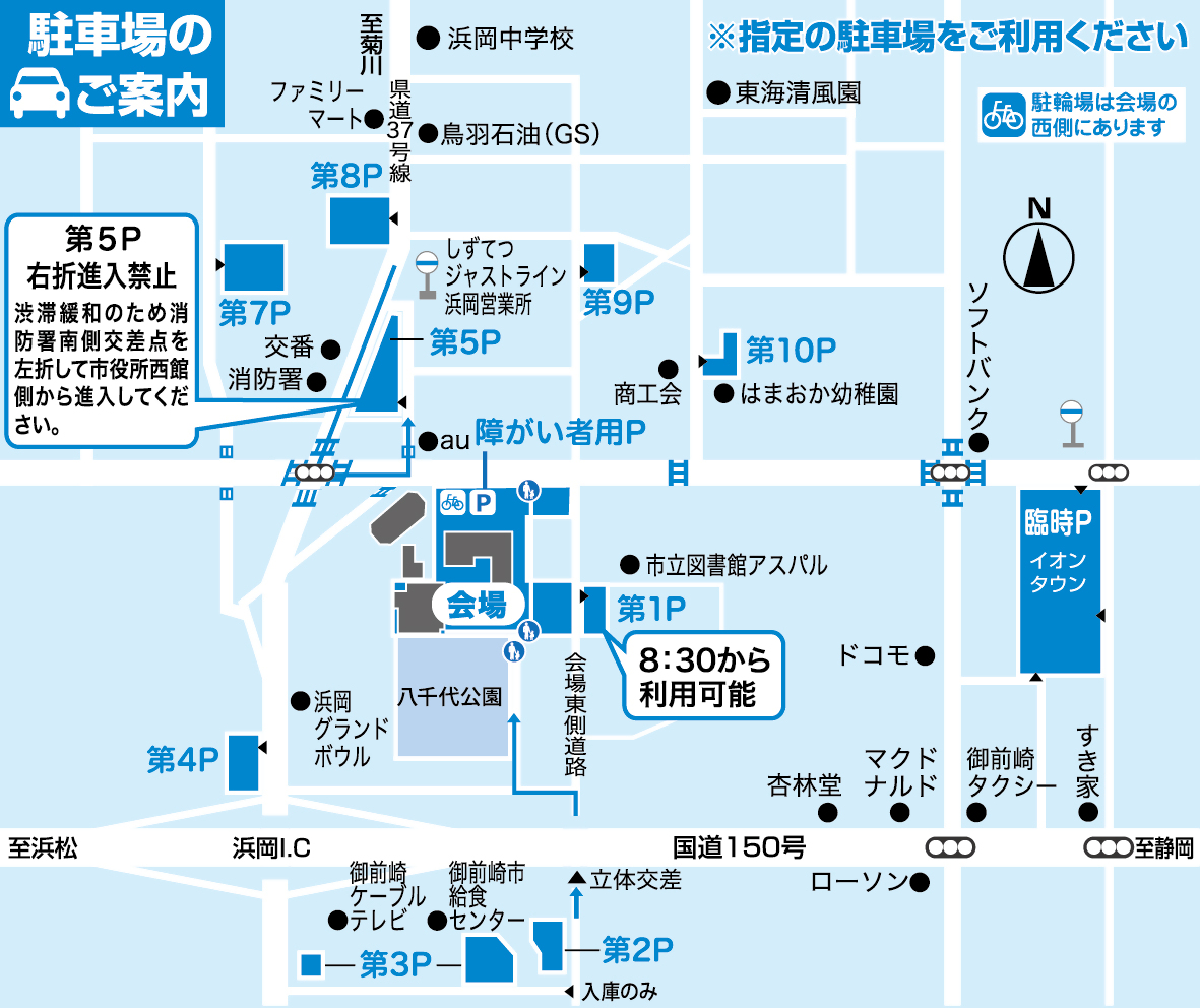 御前崎市大産業まつりでは、市役所周辺に一般駐車場をご用意しておりますが、駐車場は台数に限りがあります。また、当日は混雑が予想されますので、なるべく乗り合わせでご来場ください。