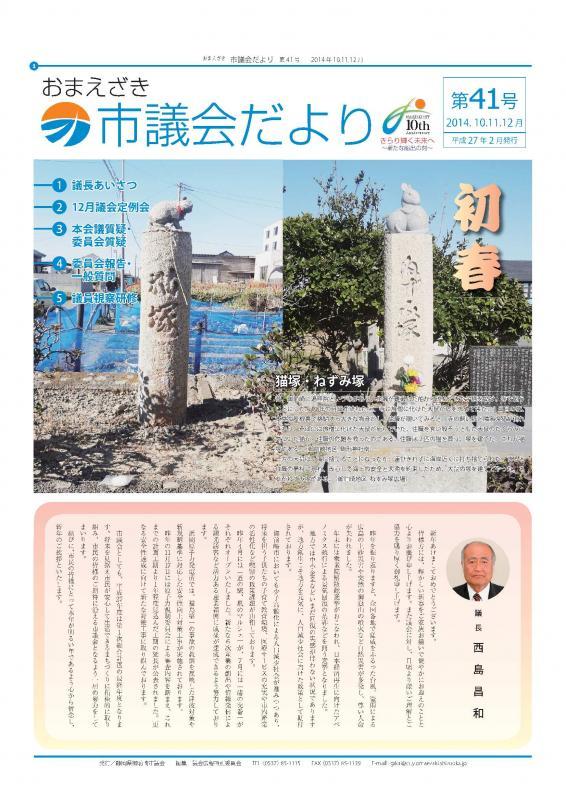 第41号平成27年2月発行 内容 市議会だより全ページ 表紙・目次・議長新年のあいさつ(1面) 12月定例会概要(2面) 本会議質疑・委員会質疑(3面) 委員会報告・一般質問1(4面) 一般質問2・議員視察研修1(5面) 議員視察研修2・議会の動き(6面) この記事に関するお問い合わせ先 議会事務局〒437-1692 静岡県御前崎市池新田5585番地電話:0537-85-1115ファックス:0537-85-1139メールでのお問い合わせはこちら 更新日:2018年03月09日