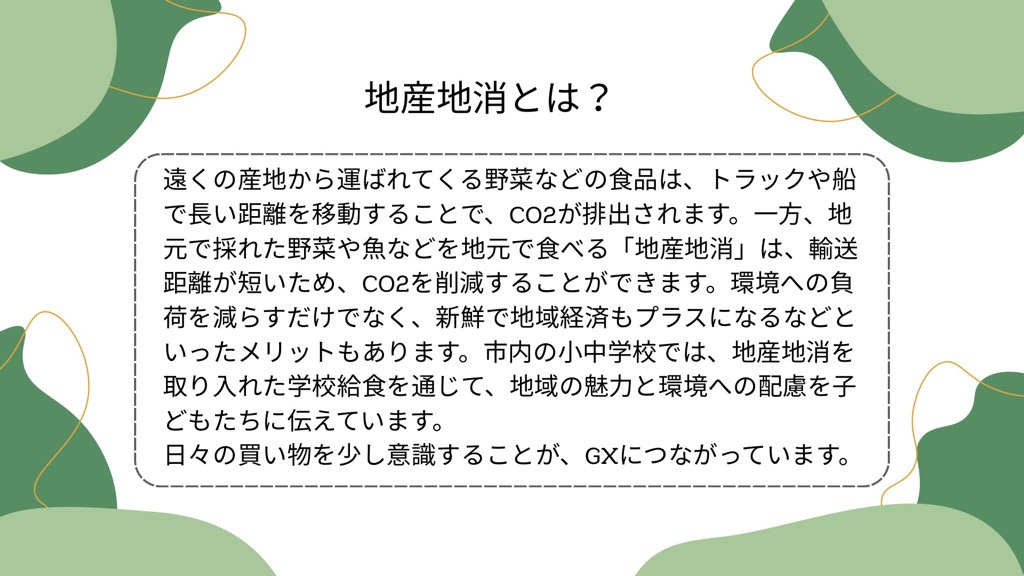 地産地消を取り入れた学校給食の例として、市内産の茶葉品種「つゆひかり」を活用した「つゆひかり入りメロンパン」や、市内で生産された芽キャベツを使った「芽キャベツのシチュー」など、地域の農産物を活かした献立が提供されました。
