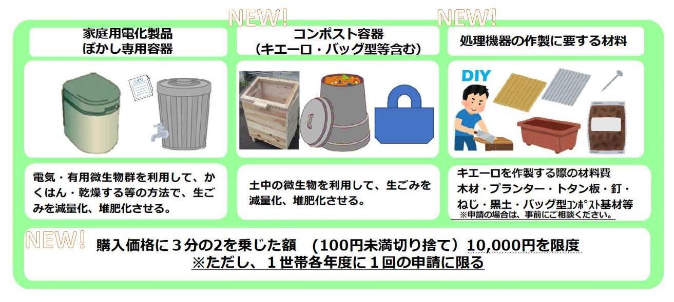御前崎市では、生ごみの減量と再資源化のために生ごみ処理機器を購入・作製する方を対象に補助金を交付しています。