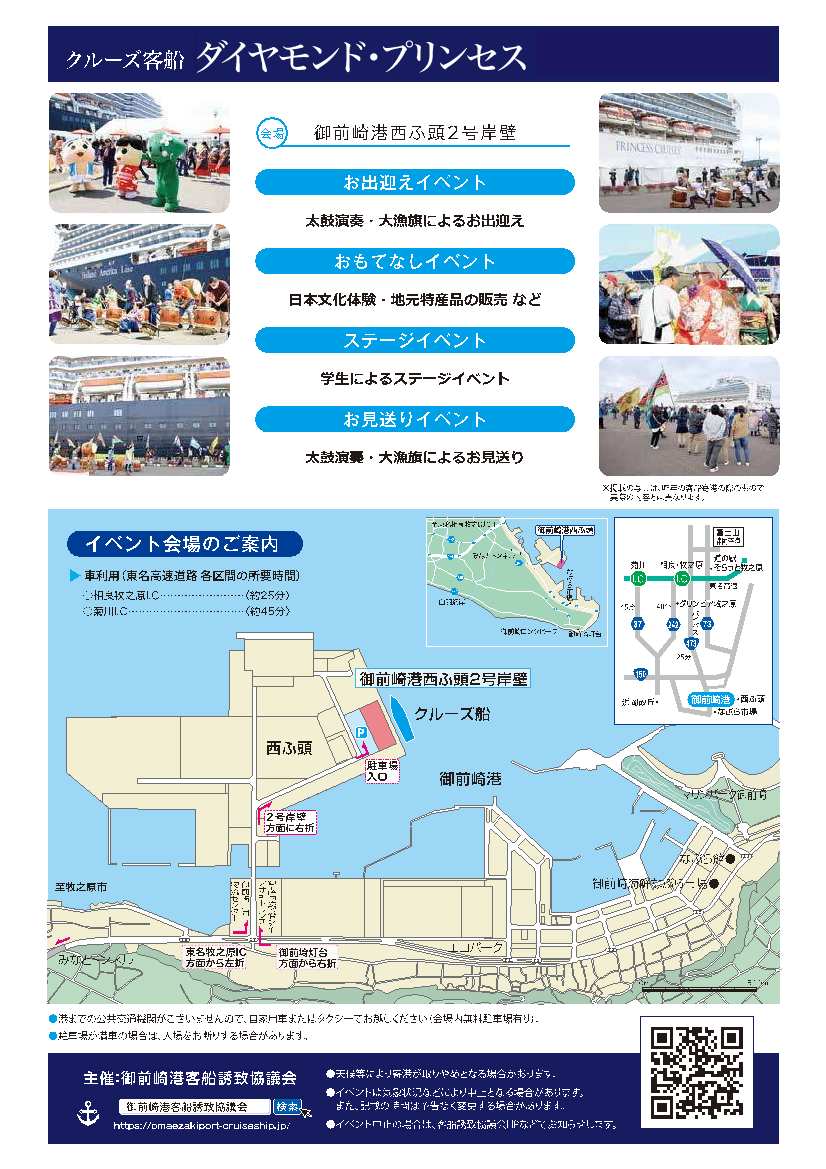 11月24日(月曜日)に外国クルーズ船「ダイヤモンド・プリンセス」が御前崎港に再び寄港します。寄港に際して岸壁ではおもてなしイベントの実施を予定しております。